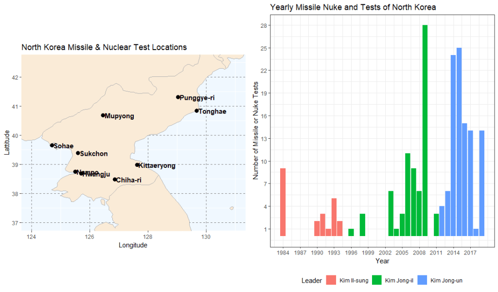 In March 2018, Trump finally accepted Kim Jong-Un’s invitation to meet.[6] It is possible that Kim Jong-Un managed to get Trump’s attention with his new Hwasong missiles. The two leaders met twice, first in Singapore and second in Hanoi, Vietnam. North Korea was not recorded to have test-launched missiles in 2018. Nonetheless, Trump’s talks with Kim Jong-Un were inconclusive. Shortly after the Hanoi meeting, North Korea resumed its short range missile tests. Consequently, the missile test number in 2019 was recorded as high as that in 2017.